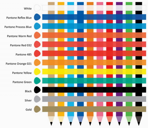 Printed colours can look different depending on the colour of the product that is being printed on and it is not always possible to get an exact colour match. To assist with colour choices, view our colour matching chart below to see how some standard Pantone colours may reproduce when printed on different colour products.